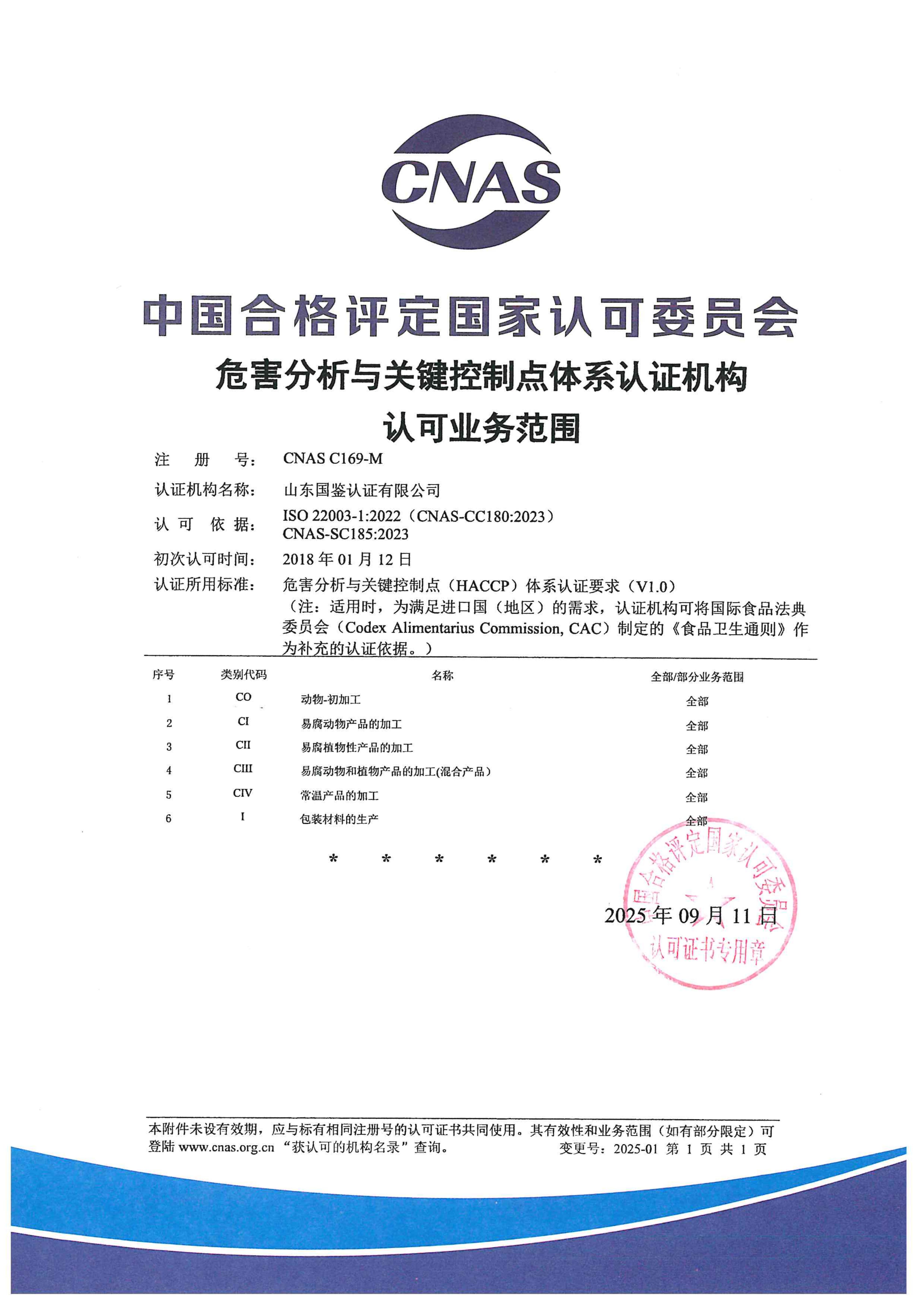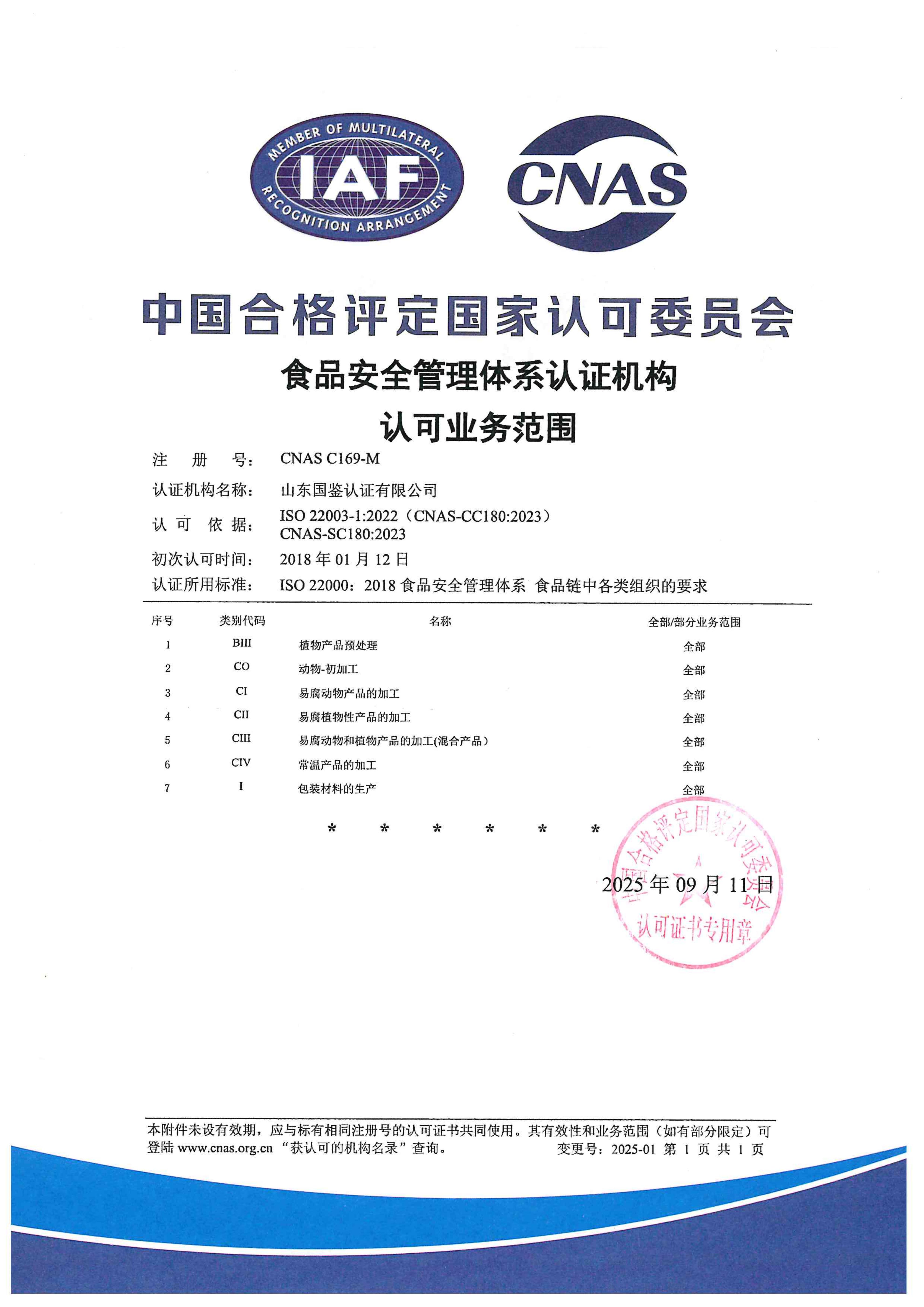 近日,山东国鉴认证有限公司FSMS/HACCP认证领域的行业类别I(食品包装和包装材料生产)获得中国合格评定国家认可委员会(CNAS)认可。